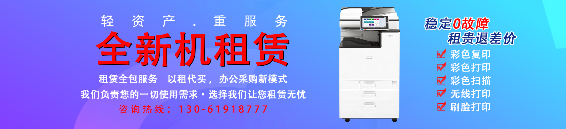企業(yè)在選擇合適的復印機供應(yīng)商時,對其主要費用不是很清楚。上海宇川作為一家專業(yè)的復印機租賃服務(wù)商,今天來給大家簡單講解:復印機租賃主要有哪些費用。1、月租費:月租費比較好理解,類似移動、聯(lián)通的電話卡一樣,有一個低的月租費。2、紙張費:月租費包含一定數(shù)量的打印。如果超出規(guī)定的打印數(shù)量,則會收取超出的打印費用。3、押金費:提供服務(wù)前交納一定數(shù)量的押金,待合作結(jié)束后,退還押金。隨著共享經(jīng)濟的盛行,很多復印機租賃公司也緊跟風向,推出了免押金服務(wù)。上海復印機租賃服務(wù)熱線:130-61918777。